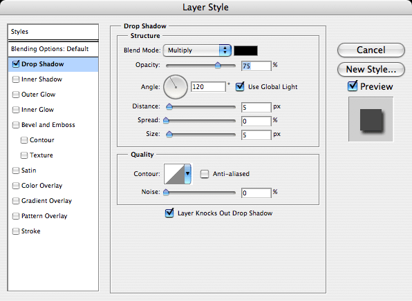 Drop ShadowFirst we will add the Drop Shadow. Click on the image to the left and use the values shown in your own Layer Styles window.
